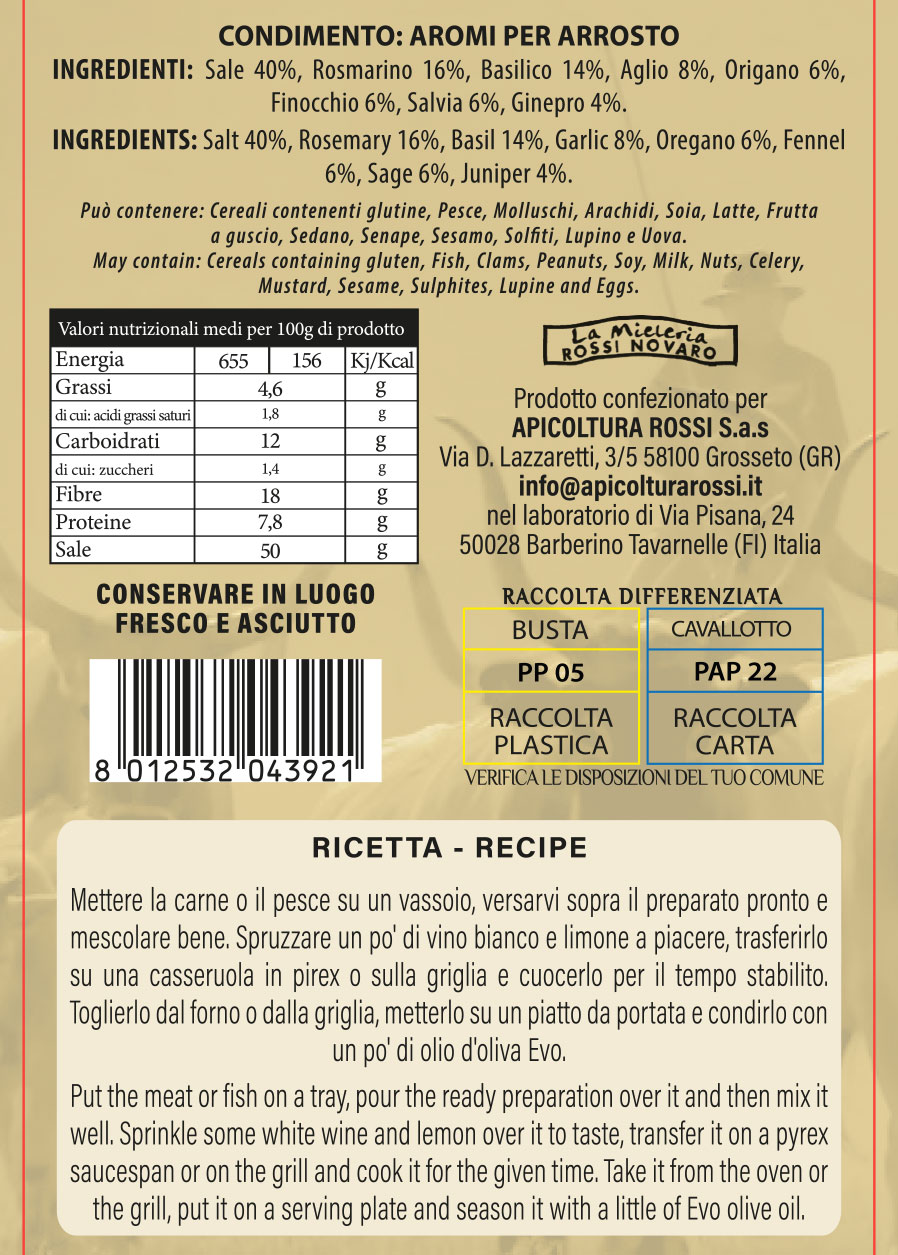 Ingredienti: sale, aglio, rosmarino, lauro, salvia, maggiorana, finocchio, ginepro e timo.