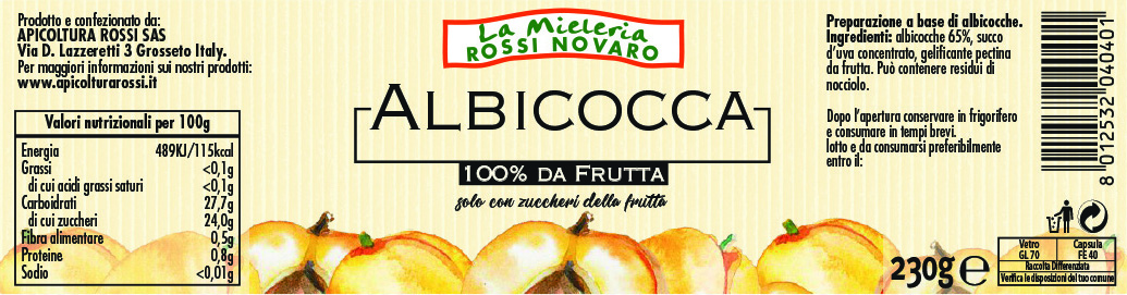 Ingredienti: albicocche 65%, succo d’uva concentrato, gelificante pectina.