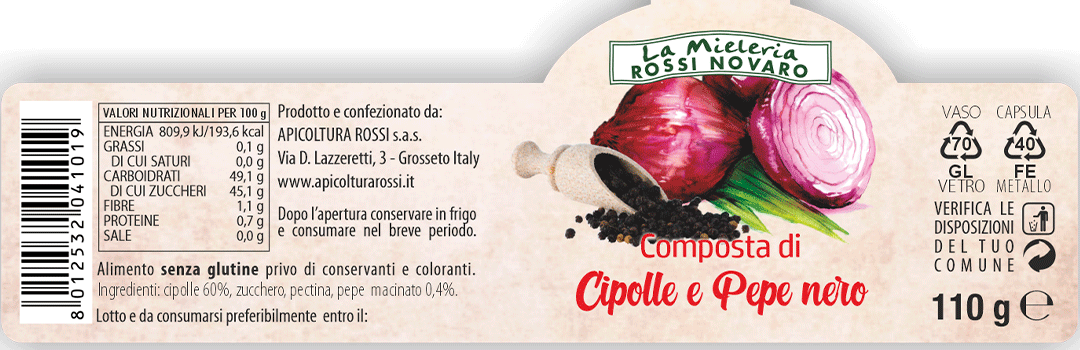 Ingredienti: cipolle 60%, zucchero, gelificante: pectina, pepe macinato 0,4%, correttore di acidità: acido citrico.