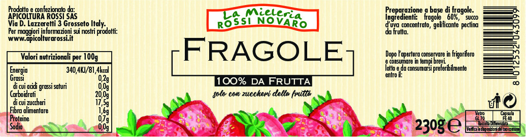Ingredienti: fragole 60%, succo d’uva concentrato, gelificante pectina.
