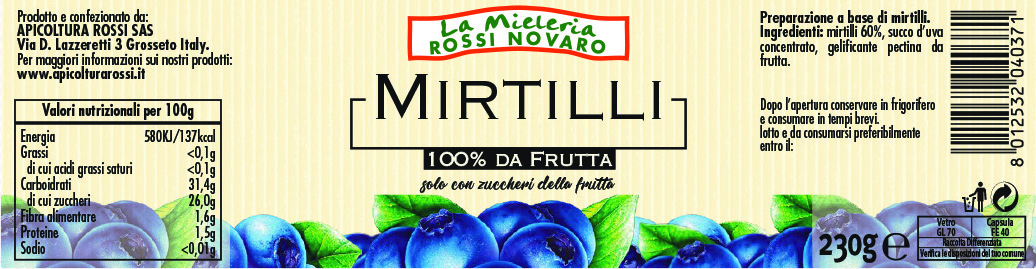 Ingredienti: mirtilli 60%, succo d’uva concentrato, gelificante pectina.