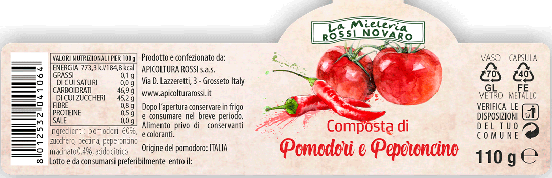 Ingredienti: pomodori 60%, zucchero, gelificante: pectina, peperoncino macinato 0,4%, correttore di acidità: acido citrico. Origine del pomodori: Italia.