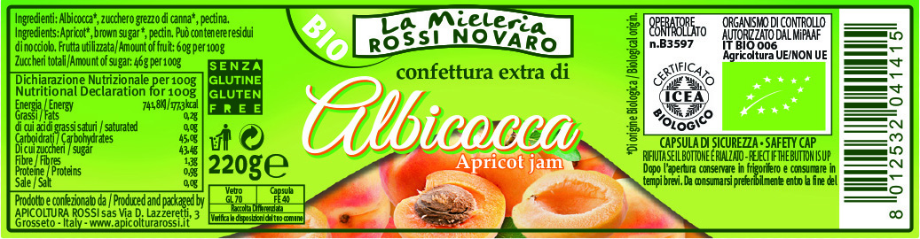 Ingredienti: albicocca 60%, zucchero grezzo di canna, gelificante pectina.