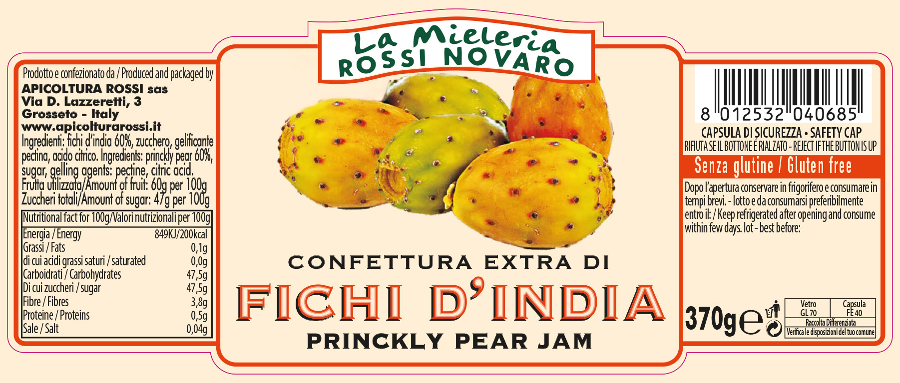 Ingredienti: fichi d’india 60%, zucchero, gelificante pectina, correttore di acidità: acido citrico.