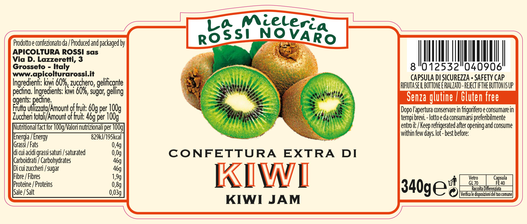 Ingredienti: kiwi 60%, zucchero, gelificante pectina