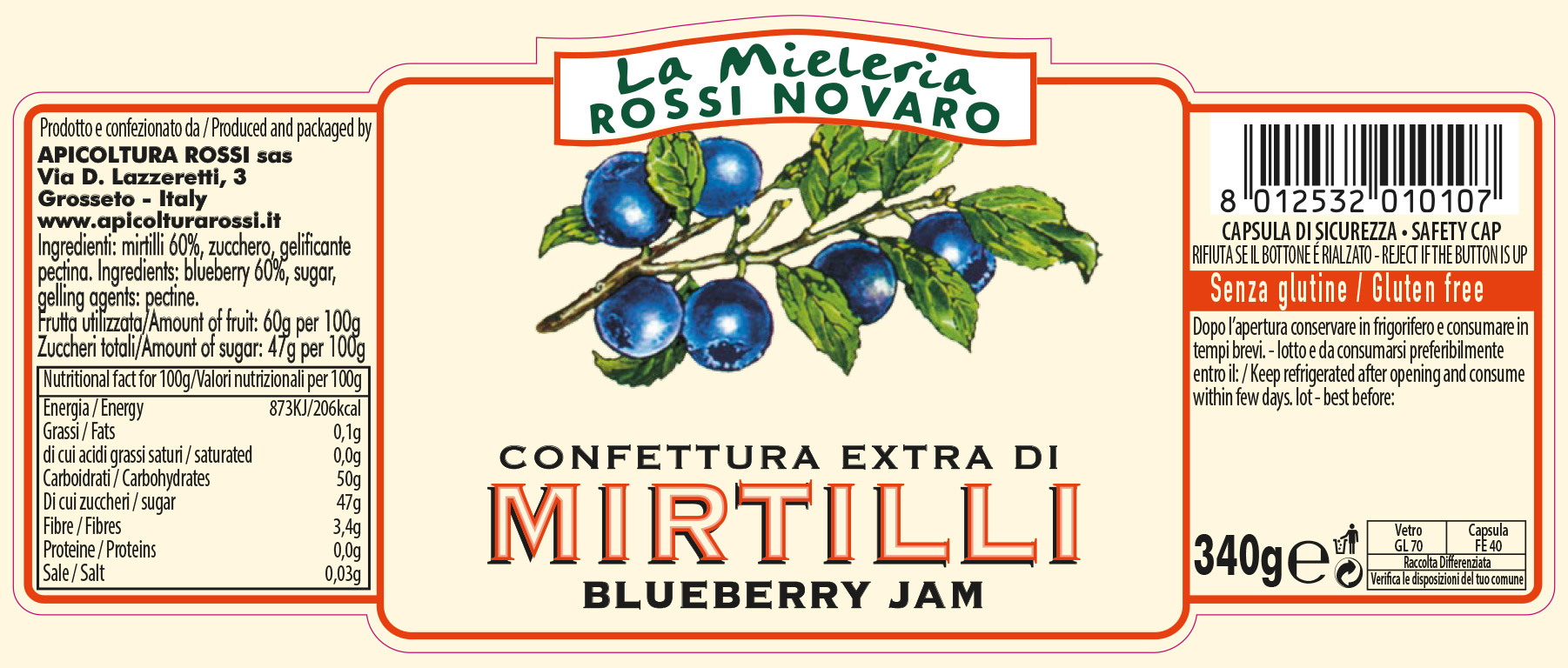 Ingredienti: mirtilli 60%, zucchero, gelificante pectina.