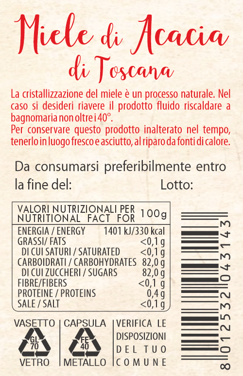 Sapore: dolce, profumato e delicato  e’ una nostra selezione tra tutti i mieli di acacia da noi prodotti nel medio appennino Toscano.