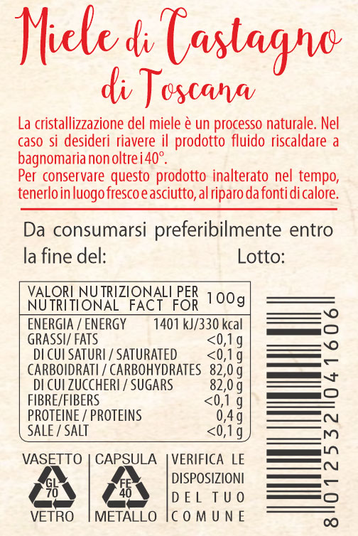 Sapore:molto forte tendente all’amarognolo, e’ una nostra selezione tra tutti i mieli di castagno da noi prodotti nell’ appennino centrale Toscano.