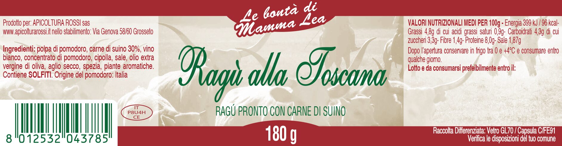 Ingredienti: polpa di pomodoro, carne di suino 30%, vino bianco, concentrato di pomodoro, cipolla, sale, olio extra vergine di oliva, aglio secco, spezia, piante aromatiche.