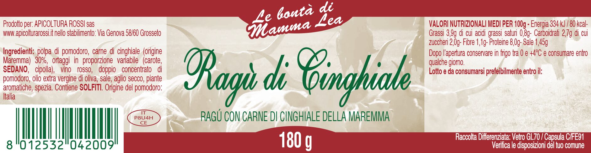 Ingredienti: polpa di pomodoro italiano, carne di cinghiale, (origine Maremma) 30% vino rosso, olio extra vergine di oliva, carote, sedano, cipolla, doppio concentrato di pomodoro, sale, piante aromatiche, spezia. Contiene solfiti.