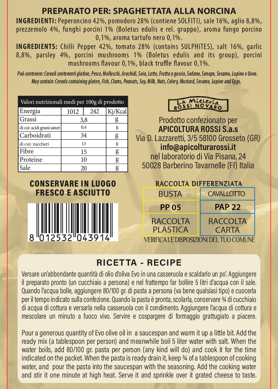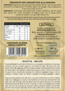 Ingredienti: Peperoncino 42%, pomodoro 28% (contiene SOLFITI), sale 16%, aglio 8,8%, prezzemolo 4%, funghi porcini 1% (Boletus edulis e rel. gruppo), aroma fungo porcino 0,1%, aroma tartufo nero 0,1%.