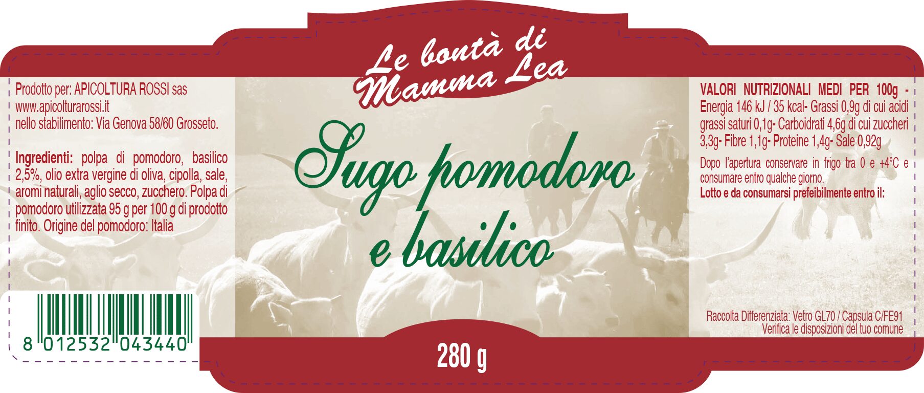 Ingredienti: polpa di pomodoro italiano, olio extra vergine di oliva, basilico 2,5%, cipolla, aglio secco, zucchero. Polpa di pomodoro utilizzata 105 g. per 100 g. di prodotto finito.